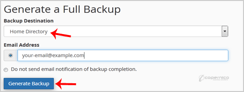 4. Dal menu a tendina, seleziona la destinazione del backup come "Home" e inserisci il tuo indirizzo email in modo da poter essere avvisato quando il backup sarà completo.