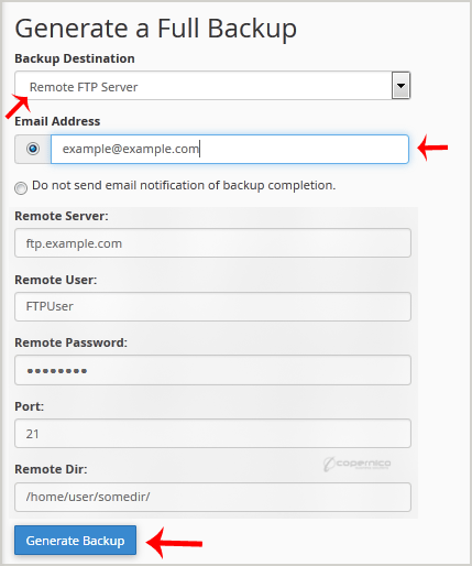5. Quan ompli els detalls de Remote FTP, fes clic al botó "Generate Backup".